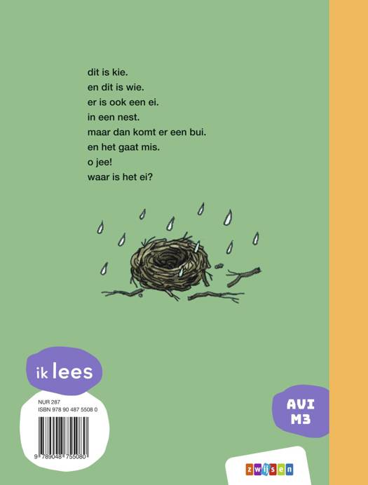 dit is kie. en dit is wie. er is ook een ei. in een nest. maar dan komt er een bui. en het gaat mis. o jee! waar is het ei?