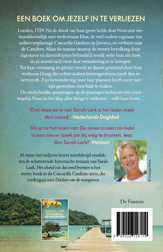 Londen, 1732. Na de dood van haar grote liefde sluit Nora een verstandshuwelijk met Elias en verruilt Engeland voor zijn suikerrietplantage Cascarilla Gardens op Jamaica. Maar de manier waarop de slaven door eigenaars en slavendrijvers behandeld worden wekt haar afschuw, en ze neemt zich voor daar verandering in te brengen. Tot haar verrassing wordt ze daarin gesteund door haar stiefzoon Doug, die echter andere beweegredenen heeft dan ze vermoedt. Zijn bewondering voor haar plannen heeft namelijk meer met zijn gevoelens voor haar te maken dan met de situatie op de plantage. De onderhuidse spanningen op het eiland leiden tot een crisis waarbij Nora in één klap alles dreigt te verliezen - zelfs haar leven… 'Het eiland van duizend bronnen' is het eerste boek over Cascarilla Gardens van Sarah Lark. Het verhaal van Nora gaat verder in 'Dochter van de mangroven'.