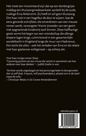 Het moet een misverstand zijn dat op een donkergrijze middag een thuiszorgmedewerkster aanbelt bij de oude, nukkige Erna Ankersmit. Zij heeft en wil geen thuiszorg. Om haar niet in een hagelbui de deur te wijzen, laat de eens gevierde schrijfster, die onverdroten aan een nieuwe roman werkt, verzorgster Vronie (moeder van een gezin met opgroeiende kinderen) toch binnen. Deze halfhartige geste vormt het begin van een vriendschap die allengs diepere lagen krijgt, culminerend in een gezamenlijke wandeltocht in Engeland langs de muur van Hadrianus. Een tocht die alles – ook het verleden van Erna en de relatie met haar gestorven echtgenoot – op scherp zet.