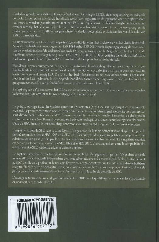 Onderhavig boek behandelt het Europees Stelsel van Rekeningen (ESR), diens rapportering en revisorale controle. In het eerste inleidende hoofdstuk wordt kort ingegaan op de opdracht waar bedrijfsrevisoren rechtstreeks worden geconfronteerd met het ESR, nl. bij Vlaamse publiekrechtelijke rechtspersonen overeenkomstig het Vlaams Rekendecreet. Het tweede hoofdstuk zoomt in op de oorsprong en de bestaansredenen van het ESR. Vervolgens schetst het derde hoofdstuk de evolutie van het wettelijk kader van ESR op Europees vlak.