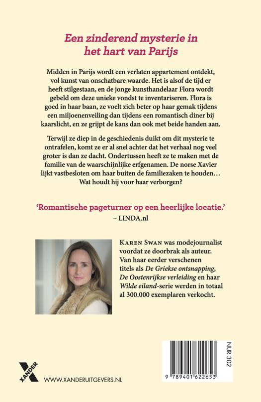 In Het Franse geheim van bestsellerauteur Karen Swan wordt midden in Parijs een verlaten appartement ontdekt, vol kunst van onschatbare waarde. Het is alsof de tijd er heeft stilgestaan, en de jonge kunsthandelaar Flora wordt gebeld om deze unieke vondst te inventariseren. Flora is goed in haar baan, ze voelt zich beter op haar gemak tijdens een miljoenenveiling dan tijdens een romantisch diner bij kaarslicht, en ze grijpt de kans dan ook met beide handen aan.