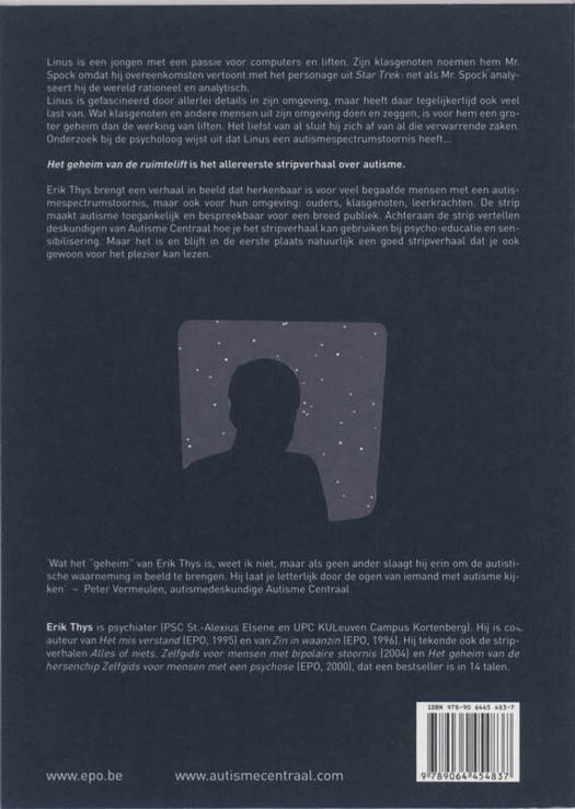 Het geheim van de ruimtelift vertelt het verhaal van Linus, een jongen met een passie voor computers en liften. De klasgenoten van Linus noemen hem Mr. Spock omdat hij overeenkomsten vertoont met het personage uit Star Trek: net als Mr. Spock analyseert hij de wereld rationeel en analytisch. Linus is gefascineerd door allerlei details in zijn omgeving, maar heeft daar tegelijkertijd ook veel last van. Wat klasgenoten en andere mensen uit zijn omgeving doen en zeggen, is voor hem een groter geheim dan de werking van liften. Het liefst van al sluit hij zich af van al die verwarrende zaken. Onderzoek bij de psycholoog wijst uit dat Linus een autismespectrumstoornis heeft... Het geheim van de ruimtelift is het allereerste stripverhaal over autisme. Erik Thys brengt een verhaal in beeld dat herkenbaar is voor veel begaafde jongeren met een autismespectrumstoornis, maar ook voor hun omgeving: ouders, klasgenoten, leerkrachten. De strip maakt autisme toegankelijk en bespreekbaar voor een breed publiek. Achteraan de strip vertellen deskundigen van Autisme Centraal hoe je het stripverhaal kan gebruiken bij psycho-educatie en sensibilisering. Maar het is en blijft in de eerste plaats natuurlijk een goed stripverhaal dat je ook gewoon voor het plezier kan lezen.