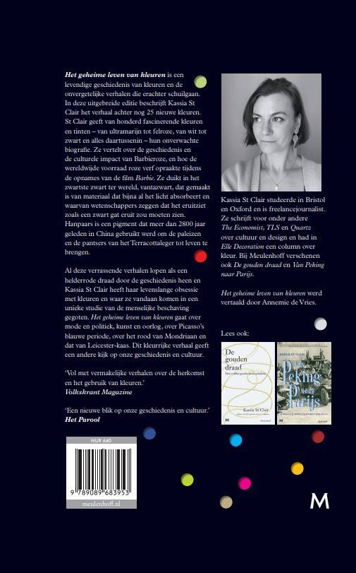 Al deze verrassende verhalen lopen als een helderrode draad door de geschiedenis heen en Kassia St Clair heeft haar levenslange obsessie met kleuren en waar ze vandaan komen in een unieke studie van de menselijke beschaving gegoten. Het geheime leven van kleuren gaat over mode en politiek, kunst en oorlog, over Picasso’s blauwe periode, over het rood van Mondriaan en dat van Leicester-kaas. Dit kleurrijke verhaal geeft een ander zicht op onze geschiedenis en cultuur.