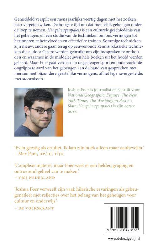 Een gemiddeld mens verspilt jaarlijks veertig dagen met het zoeken naar vergeten zaken. Kortom: de hoogste tijd om dat menselijk geheugen onder de loep te nemen. Het geheugenpaleisis een culturele geschiedenis van het geheugen, en een studie van de technieken om ons vermogen tot herinneren te beïnvloeden en effectief te trainen. Sommige technieken zijn nieuw, andere gaan terug op eeuwenoude kennis: klassieke technieken die al door Cicero werden gebruikt om zijn toespraken te onthouden en waarmee in de middeleeuwen hele boeken uit het hoofd werden geleerd. Foer ontdekt het gebruik van geheugenpaleizen, waar herinneringen in kamers worden opgeslagen, en leert getallen in beelden om te zetten. Maar Foer gaat verder dan de geheugensport en onderzoekt de ongrijpbare aard van het geheugen aan de hand van gesprekken met mensen met bijzondere geestelijke vermogens, of het tegenovergestelde, met stoornissen. Nu technologie het individuele menselijke geheugen definitief overbodig lijkt te maken, is Foers oproep tot herleving van de kunst van het onthouden des te urgenter.