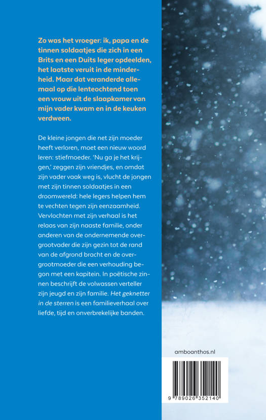In Het geknetter in de sterren van Jón Kalman Stefánsson moet de kleine jongen die net zijn moeder heeft verloren een nieuw woord leren: stiefmoeder. 'Nu ga je het krijgen,' zeggen zijn vriendjes als de jongen een stiefmoeder krijgt, en omdat zijn vader vaak weg is, vlucht de jongen met zijn tinnen soldaatjes in een droomwereld: hele legers helpen hem te strijden tegen zijn eenzaamheid. Hij krijgt ook aandacht van zijn grootmoeder, die hem verhalen vertelt over haar ouders: de ondernemende overgrootvader die de familie tot aan de afgrond bracht en de overgrootmoeder die afsprak met een kapitein. In poëtische zinnen vangt de volwassen verteller zijn jeugd en zijn familie.