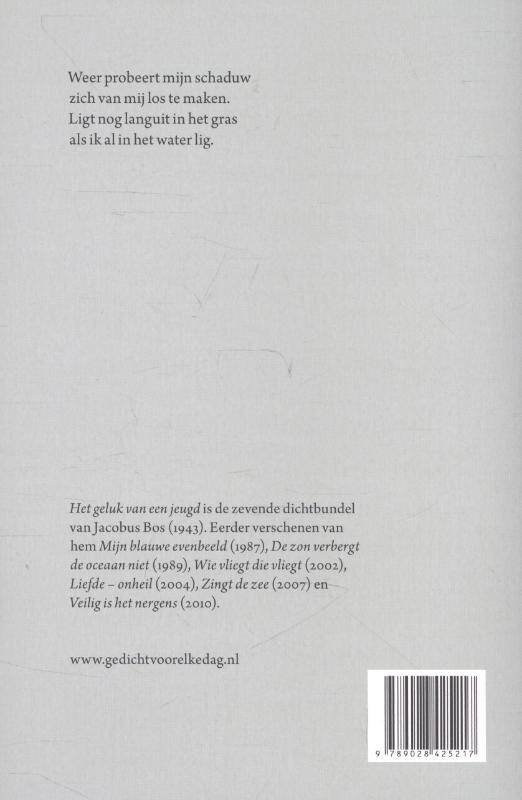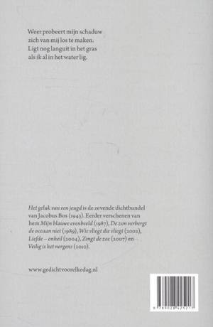 'Het geluk van een jeugd' is de zevende dichtbundel van Jacobus Bos (1943). Eerder verschenen van hem 'Mijn blauwe evenbeeld' (1987), 'De zon verbergt de oceaan niet' (1989), 'Wie vliegt die vliegt' (2002), 'Liefde - onheil' (2004), 'Zingt de zee' (2007) en 'Veilig is het nergens' (2010).
