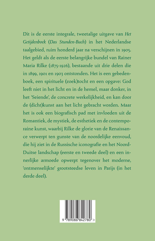 Dit is de eerste integrale, tweetalige uitgave van Het Getijdenboek (Das Stunden-Buch) in het Nederlandse taalgebied, ruim honderd jaar na verschijnen in 1905. Het geldt als de eerste belangrijke bundel van Rainer Maria Rilke (1875-1926), bestaande uit drie delen die in 1899, 1901 en 1903 ontstonden. Het is een gebedenboek, een spirituele (zoek)tocht en een opgave: God leeft niet in het licht en in de hemel, maar donker, in het ‘Seiende’, de concrete werkelijkheid, en kan door de (dicht)kunst aan het licht gebracht worden. Maar het is ook een biografisch pad met invloeden uit de Romantiek, de mystiek, de esthetiek en de contemporaine kunst, waarbij Rilke de glorie van de Renaissance verwerpt ten gunste van de noordelijke eenvoud, die hij ziet in de Russische iconografie en het Noord- Duitse landschap (eerste en tweede deel) en een innerlijke armoede opwerpt tegenover het moderne, ‘ontmenselijkte’ grootsteedse leven in Parijs (in het derde deel).