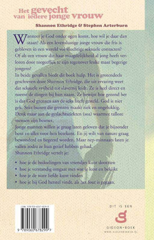Wanneer je God onder ogen komt, hoe wil je daar dan staan? Als een levenslustige jonge vrouw die fris is gebleven in een wereld vol vluchtige seksuele contacten? Of als een vrouw die haar maagdelijkheid al jong heeft verloren door toegeeflijk te zijn tegenover leuke maar begerige jongens? In beide gevallen biedt dit boek hulp. Het is grotendeels geschreven door Shannon Ethridge, die uit ervaring weet dat seksuele vrijheid tot slavernij leidt. Ze is heel direct en noemt de dingen bij hun naam. Ze bewijst hoe gezond het is dat God grenzen aan de seks heeft gesteld. God is niet gek. Seks buiten die grenzen maakt ziek en ongelukkig. Denk maar aan de geslachtsziekten (soa) waarmee talloze mensen zijn besmet. Jonge mannen willen je graag laten geloven dat je bijzonder bent en alles voor hen betekent. En jij wilt van nature graag bewonderd en begeerd worden. Maar nep-minnaars laten je vallen zodra ze hun gerief hebben gehad. Shannon Ethridge vertelt je: hoe je de bedoelingen van vriendjes kunt doorzien hoe je verstandig omgaat met wat je leest en bekijkt hoe je de ware liefde kunt vinden hoe je bij God herstel vindt, als het fout is gegaan.