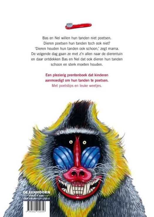 Bas en Nel willen hun tanden niet poetsen. Want dieren poetsen hun tanden toch ook niet? ‘Volgens mij wel,’ zegt mama. ‘Morgen gaan we naar de dieren- tuin,’ zegt papa. In de dierentuin ontdekken Bas en Nel hoe dieren hun tanden schoon en sterk houden.