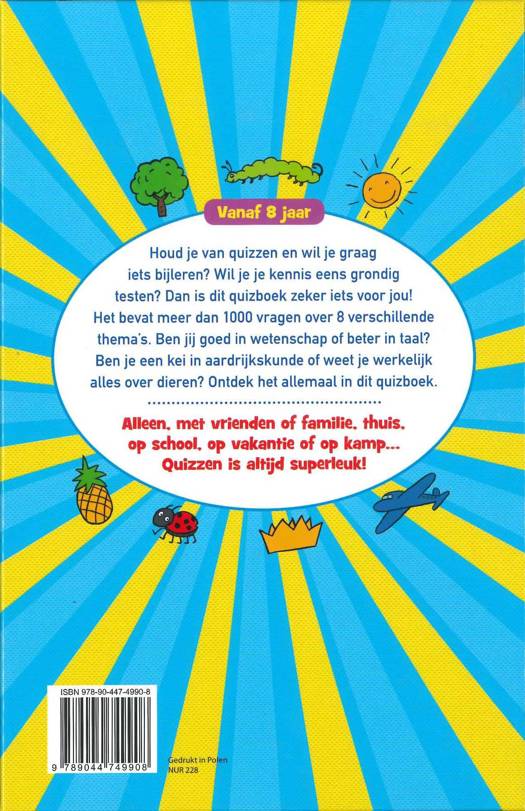 Houd je van quizzen en wil je graag iets bijleren? Wil je je kennis eens grondig testen? Dan is dit quizboek zeker iets voor jou! Het bevat meer dan 1000 vragen over 8 verschillende thema's. Ben jij goed in wetenschap of beter in taal? Ben je een kei in aardrijkskunde of weet je werkelijk alles over dieren? Ontdek het allemaal in dit quizboek. Alleen, met vrienden of familie, thuis, op school, op vakantie of op kamp… Quizzen is altijd superleuk! Vanaf 8 jaar