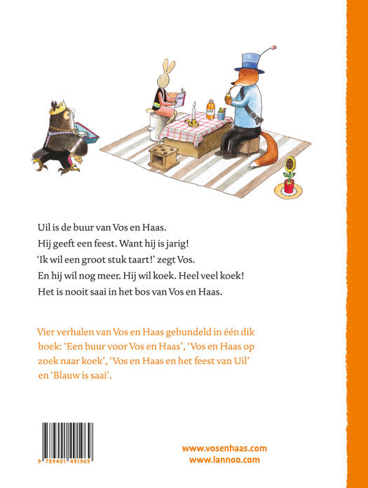 Vier verhalen van Vos en Haas gebundeld in één dik boek: Een buur voor Vos en Haas, Vos en Haas op zoek naar koek, Vos en Haas en het feest van Uil en Blauw is saai.
