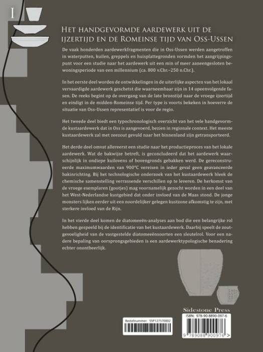 Dutch Description: De vaak honderden aardewerkfragmenten die in Oss-Ussen werden aangetroffen in waterputten, kuilen, greppels en huisplattegronden vormden het aangrijpingspunt voor een studie naar het aardewerk uit een min of meer aaneengesloten bewoningsperiode van een millennium (ca. 800 v.Chr.-250 n.Chr.). In het eerste deel worden de ontwikkelingen in de uiterlijke aspecten van het lokaal vervaardigde aardewerk geschetst die waarneembaar zijn in 14 opeenvolgende fasen. De reeks begint op de overgang van de late bronstijd naar de vroege ijzertijd en eindigt in de midden-Romeinse tijd. Per type is voorts bekeken in hoeverre de situatie van Oss-Ussen representatief is voor de regio. Het tweede deel biedt een typochronologisch overzicht van het vele handgevormde kustaardewerk dat in Oss is aangevoerd, bezien in regionale context. Het meeste kustaardewerk zal met zeezout gevuld naar het binnenland zijn getransporteerd. Het derde deel omvat allereerst een studie naar het productieproces van het lokale aardewerk. Wat de bakwijze betreft, is geconcludeerd dat het aardewerk waarschijnlijk in ondiepe kuilovens of bovengronds gebakken werd. De gereconstrueerde maximumwaarden van 900 vereisen in ieder geval geen geavanceerde bakinrichting. Bij het technologische onderzoek van het kustaardewerk bleek de chemische samenstelling verrassende verschillen op te leveren. De herkomst van de vroege exemplaren (gootjes) mag voornamelijk gezocht worden in een deel van het West-Nederlandse kustgebied dat onder invloed van de Maas stond. De jonge monsters lijken eerder uit een noordelijker gelegen kustzone afkomstig te zijn, met sterkere invloed van de Rijn. In het vierde deel komen de diatomeeën-analyses aan bod die een belangrijke rol hebben gespeeld bij de identificatie van het kustaardewerk. Daarbij speelt de zoutgevoeligheid van de vastgestelde diatomeeënsoorten een sleutelrol. Voor een nadere bepaling van oorsprongsgebieden is een aardewerktypologische benadering echter onontbeerlijk. English Description: Peter van de Broeke has studied the pottery from the late prehistoric settlement at Oss-Ussen, where habitation was (more or less) continuous for over a thousand years (800 BC - 250 AD). A typochronoly consisting of 14 phases is introduced, stretching from the late bronze age into the Roman period. Furthermore, the pottery from Oss-Ussen is studied using several different approaches including chemical and technological analyses and diatom analysis. Dutch language edition.