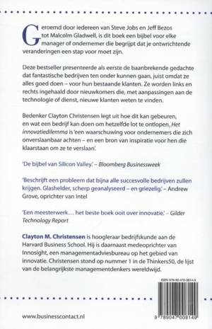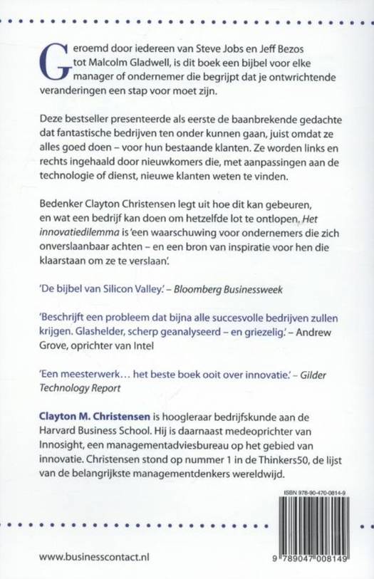 Bedenker Clayton Christensen legt uit hoe dit kan gebeuren, en wat een bedrijf kan doen om hetzelfde lot te ontlopen. Het innovatiedilemma is 'een waarschuwing voor ondernemers die zich onverslaanbaar achten – en een bron van inspiratie voor hen die klaarstaan om ze te verslaan'.