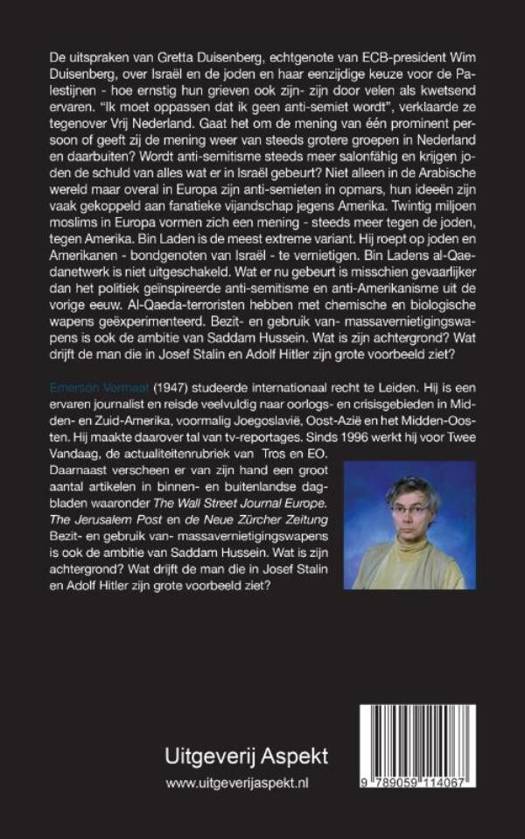 De uitspraken van Gretta Duisenberg, echtgenote van ECBpresident Wim Duisenberg, over Israël en de joden en haar eenzijdige keuze voor de Palestijnen - hoe ernstig hun grieven ook zijn- zijn door velen als kwetsend ervaren. "Ik moet oppassen dat ik geen anti-semiet wordt", verklaarde ze tegenover Vrij Nederland. Gaat het om de mening van één prominent persoon of geeft zij de mening weer van steeds grotere groepen in Nederland en daarbuiten? Wordt anti-semitisme steeds meer salonfahig en krijgen joden de schuld van alles wat er in Israël gebeurt? Niet alleen in de Arabische wereld maar overal in Europa zijn anti-semieten in opmars, hun ideeën zijn vaak gekoppeld aan fanatieke vijandschap jegens Amerika. Twintig miljoen moslims in Europa vormen zich een mening - steeds meer tegen de joden, tegen Amerika. Bin Laden is de meest extreme variant. Hij roept op joden en Amerikanen - bondgenoten van Israël - te vernietigen. Bin Ladens al Qaedanetwerk is niet uitgeschakeld. Wat er nu gebeurt is misschien gevaarlijker dan het politiek geïnspireerde anti-semitisme en anti-Amerikanisme uit de vorige eeuw. Al-Qaeda-terroristen hebben met chemische en biologische wapens geëxperimenteerd. Bezit- en gebruik van- massavernietigingswapens is ook de ambitie van Saddam Hussein. Wat is zijn achtergrond? Wat drijft de man die in Josef Stalin en Adolf Hitler zijn grote voorbeeld ziet?