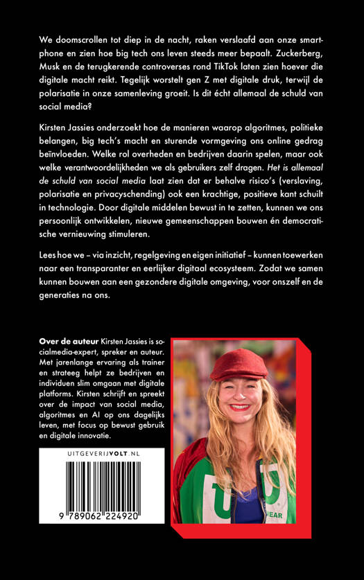 In Het is allemaal de schuld van social media laat Kirsten Jassies zien dat er naast risico’s op verslaving, polarisatie en privacyschending ook een krachtige, positieve kant schuilt in technologie. Door digitale middelen bewust in te zetten, kunnen we ons persoonlijk ontwikkelen, nieuwe gemeenschappen bouwen én democratische vernieuwing stimuleren. Hoe vinden we de balans tussen de voordelen van tech en de schaduwkanten ervan? Welke verantwoordelijkheid dragen gebruikers zelf, en welke rol spelen overheden en bedrijven?