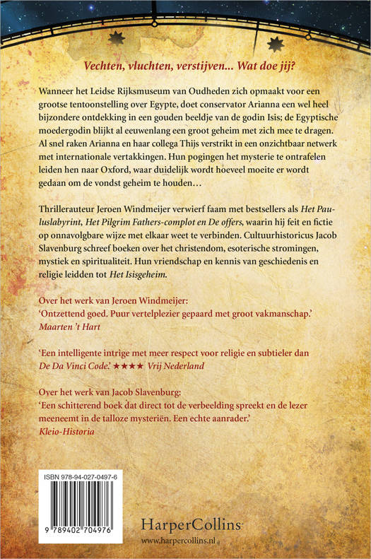 Vechten, vluchten, verstijven... Wat doe jij?Wanneer het Leidse Rijksmuseum van Oudheden zich opmaakt voor een grootse tentoonstelling over Egypte, doet conservator Arianna een wel heel bijzondere ontdekking in een gouden beeldje van de godin Isis; de Egyptische moedergodin blijkt al eeuwenlang een groot geheim met zich mee te dragen.Al snel raken Arianna en haar collega Thijs verstrikt in een onzichtbaar netwerk met internationale vertakkingen. Hun pogingen het mysterie te ontrafelen leiden hen naar Oxford, waar duidelijk wordt hoeveel moeite er wordt gedaan om de vondst geheim te houden…