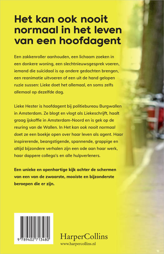 Lieke Hester is hoofdagent bij politiebureau Burgwallen in Amsterdam. Ze blogt en vlogt als Liekeschrijft, haalt graag ijskoffie in Amsterdam-Noord en is gek op de reuring van de Wallen. In Het kan ook nooit normaal doet ze een boekje open over haar leven als agent. Haar inspirerende, beangstigende, spannende, grappige en altijd bijzondere verhalen zijn een ode aan haar werk, haar dappere collega’s en alle hulpverleners.