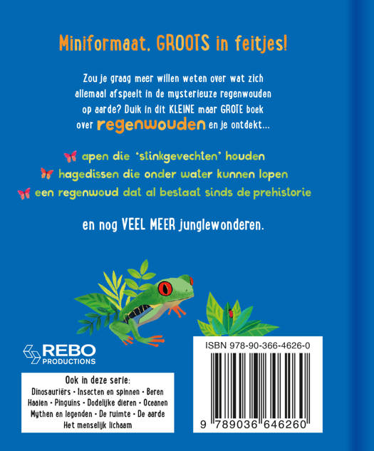 Zou je graag meer willen weten over wat zich allemaal afspeelt in de mysterieuze regenwouden op aarde? Duik in dit kleine maar grote boek voer regenwouden en je ontdekt apen die 'stinkgevechten' houden, hagedissen die onder water kunnen lopen, een regenwoud dat al bestaat sinds de prehistorie en nog veel meer junglewonderen.