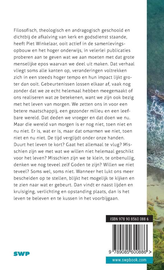Filosofisch, theologisch en andragogisch geschoold en dichtbij de afkalving van kerk en godsdienst staande, heeft Piet Winkelaar, ooit actief in de samenlevingsopbouw en het hoger onderwijs, in velerlei publicaties proberen aan te geven wat we aan moeten met dat grote menselijke epos waarvan we deel uit maken. Dat verhaal vliegt soms alle kanten op, veranderingen voltrekken zich in een steeds hoger tempo en hun impact lijkt groter dan ooit. Gebeurtenissen lossen elkaar af, vaak nog zonder dat we ze echt helemaal hebben meegemaakt of ons realiseren wat ze betekenen, want we zijn ook bezig met het leven van morgen.