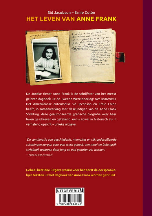 Nieuwe uitgave van de geroemde grafische roman over het leven van Anne Frank, waarin voor het eerst de oorspronkelijke teksten uit het dagboek van Anne Frank worden gebruikt. Onder begeleiding van deskundigen van de Anne Frank Stichting schreef en tekende het Amerikaanse auteursduo Sid Jacobson en Ernie Colón de eerste geautoriseerde grafische biografie van Anne Frank – zowel in historisch als verhalend opzicht een unieke uitgave. ‘De combinatie van geschiedenis, memoires en rijk gedetailleerde tekeningen zorgen voor een sterk geheel, een mooi en belangrijk stripboek waarvan door jong en oud genoten zal worden.’ Publishers Weekly