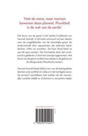 'Het leven van de geest' is het laatste hoofdwerk van Hannah Arendt. In dit boek ontvouwt ze haar ideeën over de mogelijkheden van de menselijke geest. Ze onderscheidt drie capaciteiten die iedereen bezit: denken, willen en oordelen. Tot haar dood bleef ze aan dit opus werken. Van het laatste deel, dat onvoltooid is gebleven, is hier het concept opgenomen. Van de hardbackeditie van dit boek werden meer dan 7.000 exemplaren verkocht.