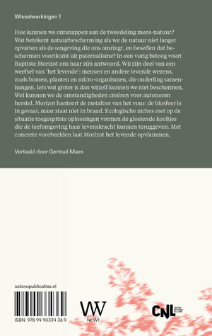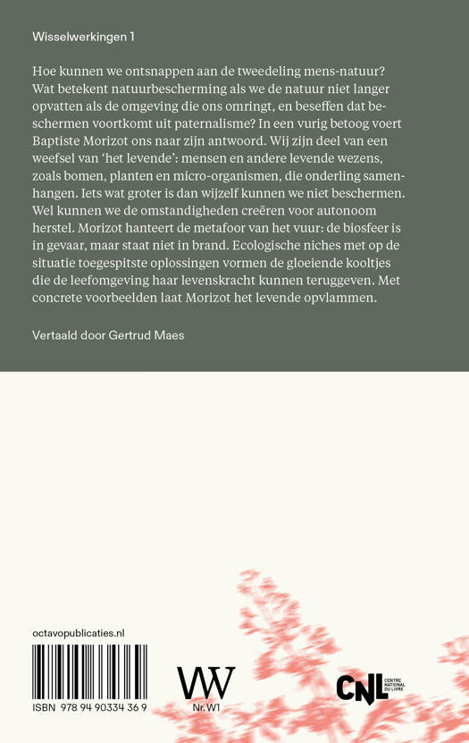 Hoe kunnen we ontsnappen aan de tweedeling mens-natuur? Wat betekent natuurbescherming als we de natuur niet langer opvatten als de omgeving die ons omringt, en beseffen dat beschermen voortkomt uit paternalisme? In een vurig betoog voert Baptiste Morizot ons naar zijn antwoord. Wij zijn deel van een weefsel van ‘het levende’: mensen en andere levende wezens, zoals bomen, planten en micro-organismen, die onderling samenhangen. Iets wat groter is dan wijzelf kunnen we niet beschermen. Wel kunnen we de omstandigheden creëren voor autonoom herstel. Morizot hanteert de metafoor van het vuur: de biosfeer is in gevaar, maar staat niet in brand. Ecologische niches met op de situatie toegespitste oplossingen vormen de gloeiende kooltjes die de leefomgeving haar levenskracht kunnen teruggeven. Met concrete voorbeelden laat Morizot het levende opvlammen.