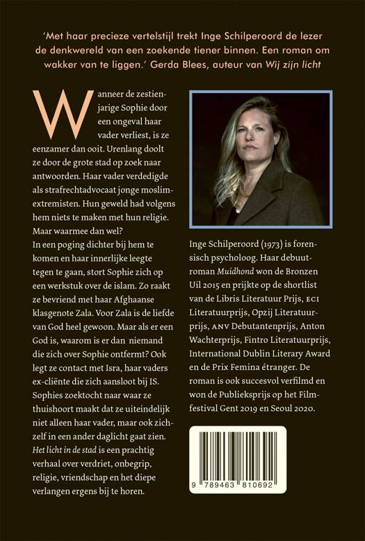 In haar tweede roman neemt Inge Schilperoord de lezer mee in een wereld die voor velen onbekend is. Op basis van jarenlange research naar jihadisme onder Nederlandse jongeren, de belevingswereld van de bekeerling en vanuit haar werk als psycholoog met verdachten op de Terroristen Afdeling van de gevangenis, slaagt ze erin om net als in haar internationaal bejubelde debuut Muidhond fascinerend dicht onder de huid van een niet-alledaags personage te kruipen.