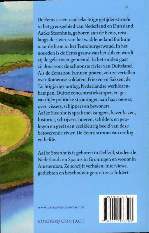 Aafke Steenhuis, geboren aan de Eems, reisde langs de rivier. Van de Noordzee-monding bij het Waddeneiland Borkum, naar de bron in het Teutoburgerwoud. In het noorden is de Eems grauw van het slib en wordt zij de gele rivier genoemd. In het zuiden gaat zij door voor de schoonste rivier van Duitsland. In het noorden verrijzen kolencentrales aan haar oevers, in het zuiden worden de oude meanders hersteld.Alleen schippers, vissers en bewoners weten hoe mooi de Eems is. Aafke Steenhuis praat met zangers, havenbazen, vissers, historici, schrijvers, boeren, schilders en geologen en geeft een veekleurig en veelzijdig beeld van deze betoverende rivier.