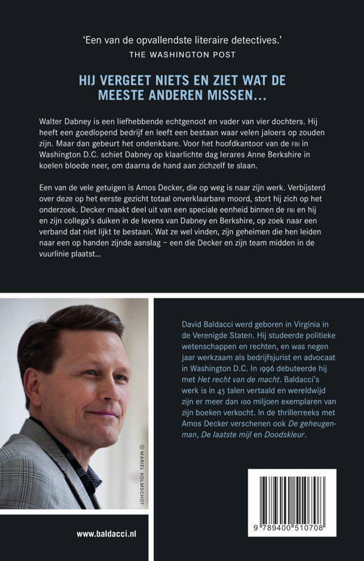 Een van de vele getuigen is Amos Decker, een man die niets vergeet en ziet wat de meeste anderen missen. Verbijsterd over deze op het eerste gezicht totaal onverklaarbare moord, stort hij zich op het onderzoek. Decker maakt deel uit van een speciale eenheid binnen de FBI en hij en zijn collega’s duiken in de levens van Dabney en Berkshire, op zoek naar een verband dat niet lijkt te bestaan. Wat ze wel vinden, zijn geheimen die hen leiden naar een op handen zijnde aanslag – een die Decker en zijn team midden in de vuurlinie plaatst…