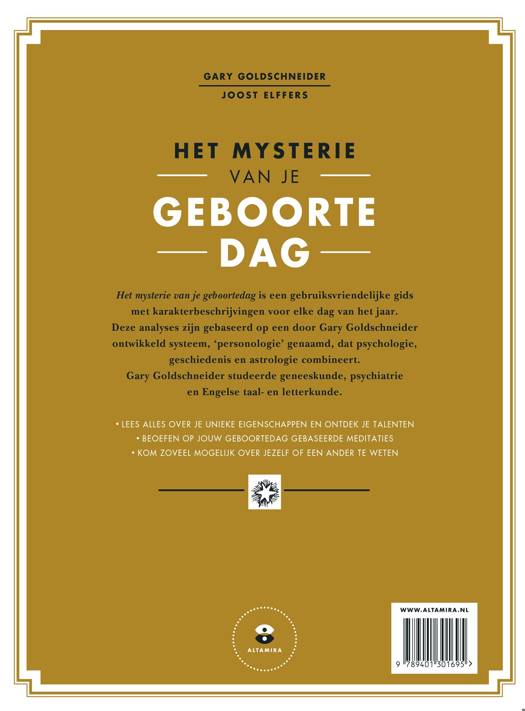In 'Het mysterie van je geboortedag' van Gary Goldschneider leer je waarom jouw geboortedag zo uniek is en wat deze dag betekent voor jou als persoon. Door Goldschneiders unieke personologie-systeem, dat steunt op principes uit astrologie, psychologie en geschiedenis, ontdek je jouw unieke eigenschappen en talenten. Daarnaast leer je speciale meditaties die bedacht zijn voor jouw geboortedag en hierdoor perfect zijn voor jouw spirituele ontwikkeling. 'Het mysterie van je geboortedag' is een zeer gebruiksvriendelijke gids die jou helpt je geboortedag en haar mysteries te ontrafelen.