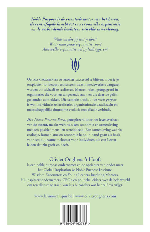 Het Noble Purpose Boek, geïnspireerd door het levensverhaal van de auteur, maakt werk van een economie en samenleving met een positief mens- en wereldbeeld. Een samenleving waarin ecologie, humanisme en economie hand in hand gaan als basis voor een duurzame toekomst voor individuen die een Leven leiden dat zin geeft en heeft.