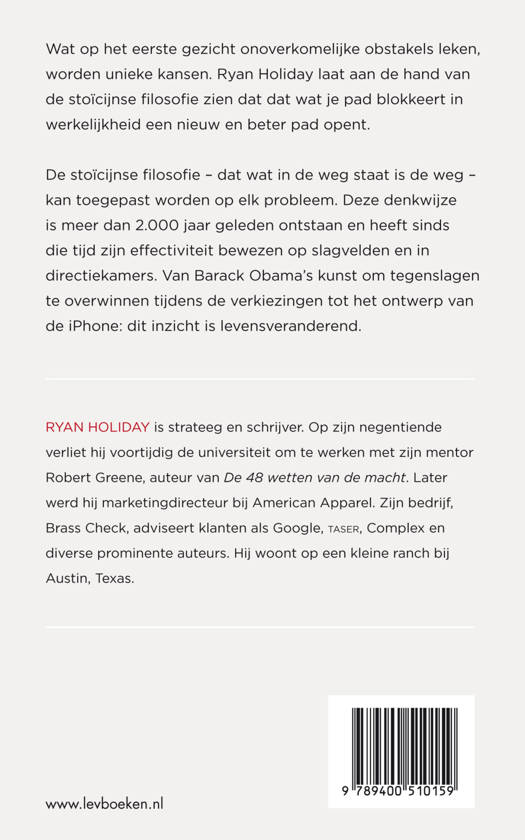 De stoïcijnse filosofie – dat wat in de weg staat is de weg – kan toegepast worden op elk probleem. Het is meer dan 2.000 jaar geleden ontdekt en heeft sinds die tijd zijn effectiviteit bewezen op slagvelden en board rooms. Van het vermogen van Barack Obama om tegenslagen te overwinnen tijdens de verkiezingen, tot het ontwerp van de iPhone, dit inzicht maakt mensen onoverwinnelijk.