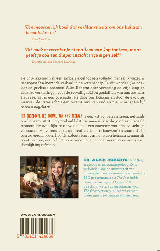 Een rijzende ster aan het wetenschapsfirmament Alice Roberts ontrafelt op meesterlijke wijze het ongelofelijke toeval van het menselijke bestaan. Een boeiende mix van anatomie en archeologie, uiterst toegankelijk voor een breed publiek. Ons menselijk lichaam is een toevallige samenloop van omstandigheden, gekneed door vele miljoenen jaren evolutie. Alice Roberts toont hoe de evolutie zijn echo's heeft nagelaten in ons lijf, waardoor het een bizarre mix is van oud en nieuw. Soms ingenieus geconstrueerd, soms aandoenlijk imperfect. Zo verklaart ze onder meer waarom we sporen van kieuwen hebben, en waarom zoveel mensen kampen met rugproblemen.