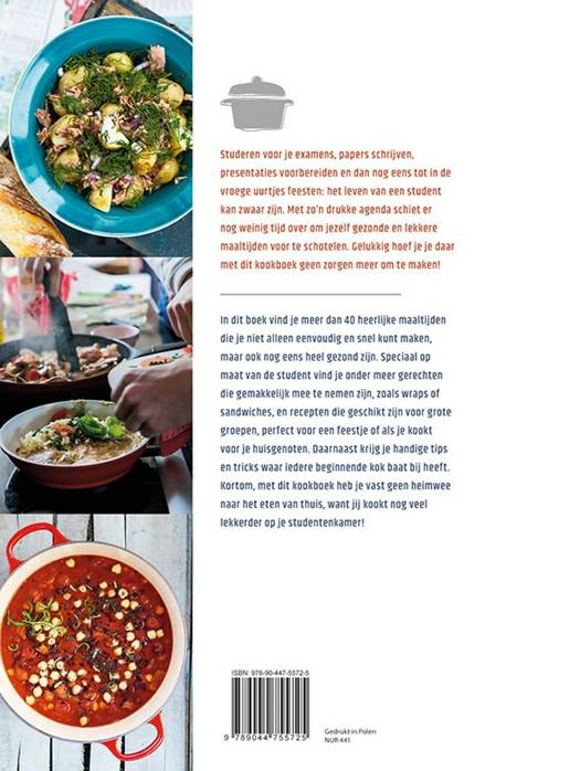 Studeren voor je examens, papers schrijven, presentaties voorbereiden en dan nog eens tot in de vroege uurtjes feesten: het leven van een student kan zwaar zijn. Met zo'n drukke agenda schiet er nog weinig tijd over om jezelf gezonde en lekkere maaltijden voor te schotelen. Gelukkig hoef je je daar met dit kookboek geen zorgen meer om te maken! In dit boek vind je meer dan 40 heerlijke maaltijden die je niet alleen eenvoudig en snel kunt maken, maar ook nog eens heel gezond zijn. Speciaal op maat van de student vind je onder meer gerechten die gemakkelijk mee te nemen zijn, zoals wraps of sandwiches, en recepten die geschikt zijn voor grote groepen, perfect voor een feestje of als je kookt voor je huisgenoten. Daarnaast krijg je handige tips en tricks waar iedere beginnende kok baat bij heeft. Kortom, met dit kookboek heb je vast geen heimwee naar het eten van thuis, want jij kookt nog veel lekkerder op je studentenkamer!