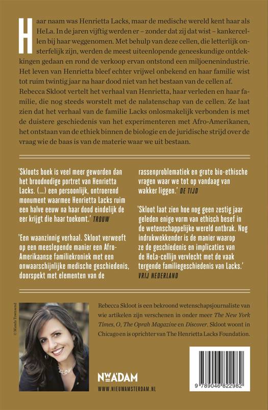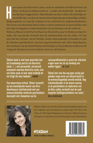 Haar naam was Henrietta Lacks, maar de medische wereld kent haar als HeLa. In de jaren '50 werden haar kankercellen zonder dat zij dat wist bij haar weggenomen. Met behulp van deze cellen, die letterlijk onsterfelijk zijn, werden de meest uiteenlopende geneeskundige ontdekkingen gedaan en rond de verkoop ervan ontstond een miljoenenindustrie. Het leven van Henrietta bleef echter vrijwel onbekend en ook haar familie wist tot ruim dertig jaar geleden niet van het bestaan van de cellen af. Rebecca Skloot vertelt het verhaal van de 'HeLa-cellen', maar laat ons vooral ook kennis maken met Henrietta, haar verleden en haar familie, die nog steeds worstelt met de nalatenschap van de cellen. Ze laat zien dat het verhaal van de familie Lacks onlosmakelijk verbonden is met de duistere geschiedenis van het experimenteren met Afrikaans-Amerikanen, het ontstaan van de ethiek binnen de biologie en de juridische strijd over de vraag of we de baas zijn over de materie waarvan we zijn gemaakt.