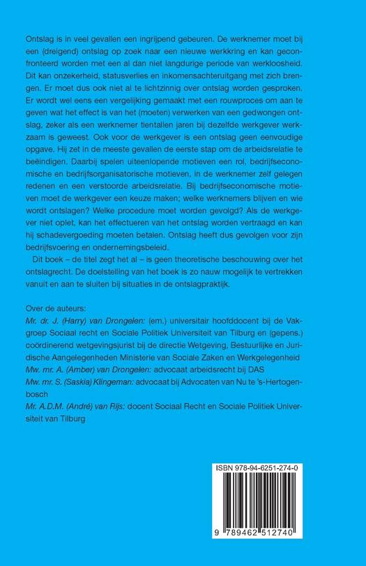 Ontslag is in veel gevallen een ingrijpend gebeuren. De werknemer moet bij een (dreigend) ontslag op zoek naar een nieuwe werkkring en kan geconfronteerd worden met een al dan niet langdurige periode van werkloosheid. Dit kan onzekerheid, statusverlies en inkomensachteruitgang met zich brengen. Er moet dus ook niet al te lichtzinnig over ontslag worden gesproken. Er wordt wel eens een vergelijking gemaakt met een rouwproces om aan te geven wat het effect is van het (moeten) verwerken van een gedwongen ontslag, zeker als een werknemer tientallen jaren bij dezelfde werkgever werkzaam is geweest. Ook voor de werkgever is een ontslag geen eenvoudige opgave. Hij zet in de meeste gevallen de eerste stap om de arbeidsrelatie te beëindigen. Daarbij spelen uiteenlopende motieven een rol, bedrijfseconomische en bedrijfsorganisatorische motieven, in de werknemer zelf gelegen redenen en een verstoorde arbeidsrelatie. Bij bedrijfseconomische motieven moet de werkgever een keuze maken; welke werknemers blijven en wie wordt ontslagen? Welke procedure moet worden gevolgd? Als de werkgever niet oplet, kan het effectueren van het ontslag worden vertraagd en kan hij schadevergoeding moeten betalen. Ontslag heeft dus gevolgen voor zijn bedrijfsvoering en ondernemingsbeleid. Dit boek – de titel zegt het al – is geen theoretische beschouwing over het ontslagrecht. De doelstelling van het boek is zo nauw mogelijk te vertrekken vanuit en aan te sluiten bij situaties in de ontslagpraktijk.