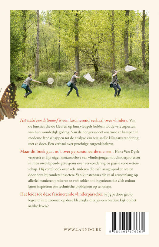 Het orakel van de bosnimf is een fascinerend verhaal over vlinders. Van de functies die de kleuren op hun vleugels hebben tot de vele aspecten van hun wonderlijk gedrag. Van de hongersnood waarmee ze kampen in moderne landschappen tot de analyse van wat snelle klimaatverandering met ze doet. Een verhaal over prachtige zorgenkinderen. Maar dit boek gaat ook over gepassioneerde mensen. Hans Van Dyck verweeft er zijn eigen metamorfose van vlinderjongen tot vlinderprofessor in. Een meeslepende getuigenis over verwondering en passie voor wetenschap. Hij vertelt ook over vele anderen die zich aangesproken weten door deze bijzondere insecten. Van kunstenaars die ze al eeuwenlang op allerlei manieren proberen te verbeelden tot ingenieurs die zich erdoor laten inspireren om technische problemen op te lossen. Het leidt tot deze fascinerende vlinderparadox: krijg je door gebiologeerd in te zoomen op deze kleurrijke diertjes een bredere kijk op het aardse leven? 'Wie op een wetenschappelijke manier rigoureus en diep graaft in de biologie van één of enkele soorten, kan juist een kijk door een breedhoeklens ontwikkelen op het leven. Dat lijkt op het eerste gezicht een paradox - inzoomen en tegelijk toch een breder beeld krijgen - maar het is er geen. Een vlinder is immers niet alleen een vlinder, maar ook een insect, een dier, een levensvorm. Je bestudeert niet alleen kenmerken die uniek zijn voor de vlinder, maar ook eigenschappen die vele tot alle levensvormen gemeenschappelijk hebben. Je achterhaalt fundamentele principes over de relaties tussen een organisme en zijn omgeving. Die helpen om iets van het biodiverse leven te begrijpen. Het onderzoek zegt alles over vlinders, maar tegelijk ook veel over andere levensvormen.' Vooral de studie van een bijzondere vlinder, het bont zandoogje of de Pararge aegeria, loopt als een rode draad door het werk van vlinderprofessor Hans Van Dyck. Aegeria was een profetische bosnimf en beschermgodin van Rome, die wijze raad gaf aan haar man, koning Numa Pompilius. Na zijn dood veranderde ze in een bron. Het bont zandoogje is dus vernoemd naar een mythologische, wijze bosnimf, een bron van kennis en inzicht. Een wetenschappelijk orakel.