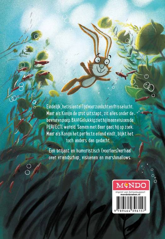 Eindelijk, het is lente! Tijd voor zonlicht en frisse lucht. Maar als Konijn de grot uitstapt, zit alles onder de bevroren poep. BAH! Gelukkig ziet hij in een visioen de PERFECTE wereld. Samen met Beer gaat hij op zoek. Maar als Konijn het perfecte eiland vindt, blijkt het toch anders dan gedacht ... Een briljant en humoristisch (voorlees)verhaal over vriendschap, visioenen en marshmallows.