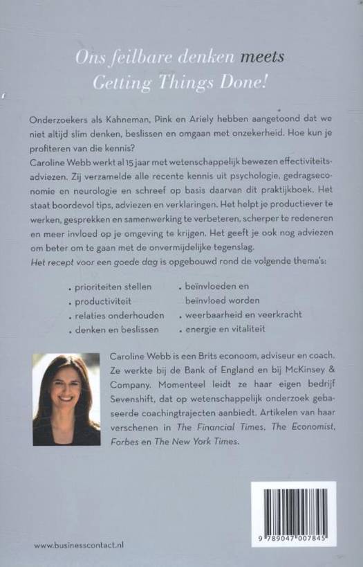 Onderzoekers als Kahneman, Pink en Ariely hebben aangetoond dat we beter zouden kunnen denken, beslissen en omgaan met onzekerheid. Maar hoe breng je die wetenschap in de praktijk? Kun je je leven anders inrichten? Caroline Webb werkt al vijftien jaar met wetenschappelijk bewezen effectiviteitsadviezen. Zij verzamelde alle recente kennis op het gebied van psychologie, gedragseconomie en neurologie en schreef op basis daarvan dit praktijkboek. Het staat boordevol tips, adviezen en verklaringen. Het helpt je productiever te werken, gesprekken en samenwerking te verbeteren, scherper te redeneren en meer invloed op je omgeving te krijgen. Het geeft je ook nog adviezen om beter om te gaan met de onvermijdelijke tegenslag. Het recept voor een goede dag is opgebouwd rond de volgende thema's: • prioriteiten stellen • productiviteit • relaties onderhouden • denken en beslissen • beïnvloeden en beïnvloed worden • weerbaarheid en veerkracht • energie en vitaliteit