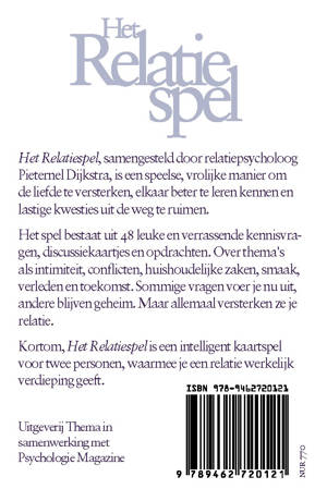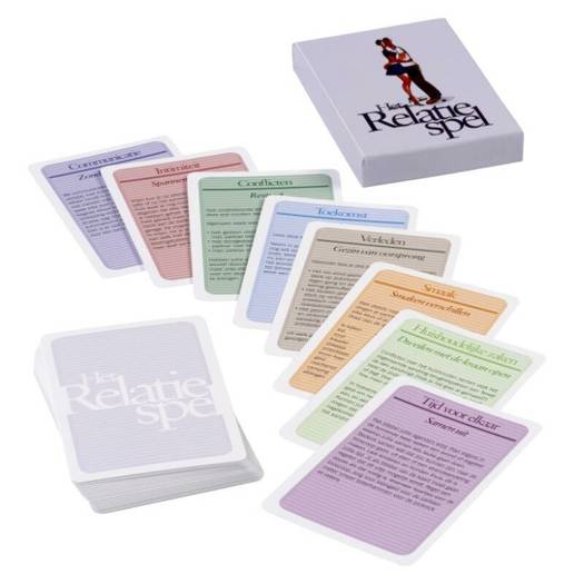 Het Relatiespel, samengesteld door relatiepsycholoog Pieternel Dijkstra, is een speelse, vrolijke manier om de liefde te versterken, elkaar beter te leren kennen en lastige kwesties uit de weg te ruimen.