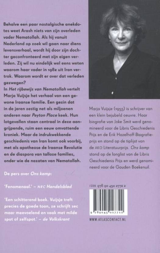 Behalve een paar nostalgische anekdotes weet Arash niets van zijn overleden vader Nematollah. Als hij vanuit Nederland op zoek wil gaan naar diens levensverhaal, wordt hij door zijn dochter geconfronteerd met zijn eigen verleden. Zij wil nu eindelijk wel eens weten waarom haar vader in 1982 uit Iran vertrok. Waarom wordt er over dat verleden gezwegen? In Het rijbewijs van Nematollah vertelt Marja Vuijsje het verhaal van een gewone Iraanse familie. Een gezin dat in de jaren zestig net als miljoenen anderen naar Peyton Place keek. Hun lotgevallen staan centraal in deze aangrijpende, ruim een eeuw omvattende kroniek. Maar de indrukwekkende geschiedenis van Iran komt ook voorbij, met als apotheose de Iraanse Revolutie en de diaspora van talloze families, onder wie de nazaten van Nematollah.