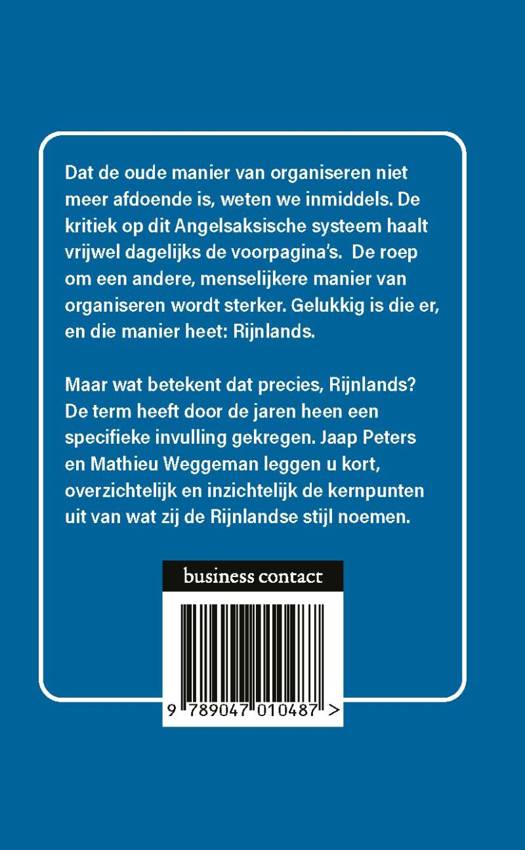 Het Rijnland-model is volop in het nieuws. Zeker nu de kritiek op het Amerikaanse (Angelsaksische) kapitalistische systeem dagelijks de voorpaginas haalt, wordt de roep om een andere wijze van besturen en bedrijfsvoering sterker. Maar wat betekent dat nu, Rijnlands? De term is al lang geleden geïntroduceerd, en heeft door de jaren heen in de praktijk een specifieke invulling gekregen. Jaap Peters en Mathieu Weggeman leggen in dit boekje op een overzichtelijke en inzichtelijke manier de kernpunten uit van wat zij de Rijnlandse stijl noemen. Het is namelijk meer dan een model: het is een manier van organiseren, een bedrijfsmodel én een manier van met elkaar omgaan. Met respect en oog voor wederzijdse belangen, zonder daarbij de doelmatigheid en de winstgevendheid uit het oog te verliezen.'