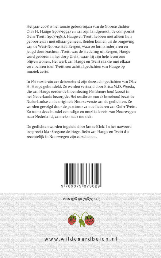 De Noorse dichter Olav H. Hauge (1908-1994) en zijn landgenoot, de componist Geirr Tveitt (1908-1981) hebben niet alleen hun geboortejaar met elkaar gemeen. Beiden komen uit de omgeving van de West-Noorse stad Bergen, waar ze hun kinderjaren en jeugd doorbrachten. Tveitt was de stedeling uit Bergen, Hauge werd geboren in het dorp Ulvik, waar hij zijn hele leven zou blijven wonen. Het werk van Hauge en Tveitt raakte met elkaar vervlochten toen Tveitt een achttal gedichten van Hauge op muziek zette. In Het roestbruin van de hemelrand zijn deze acht gedichten van Olav H. Hauge gebundeld. In de bundel is ook opgenomen de partituur van de liederen van Geirr Tveitt. De gedichten werden vertaald door Erica M.D. Weeda, die van Hauge eerder de bloemlezing Het blauwe land (2002) in het Nederlands bezorgde. Het roestbruin van de hemelrand bevat de Nederlandse en de originele Noorse versie van de gedichten. Ze worden voorafgegaan door een brief van de dichter aan Erica Weeda, waarin hij haar schrijft welke versie van zijn gedichten ze als uitgangspunt voor haar vertaling zou moeten nemen. Uit de brief blijkt dat hij zijn gedichten achteraf vaak veranderde. Het verklaart waarom de tekst van de gedichten af en toe afwijkt van de tekst in de partituur. Zo toont deze bundel een talige en muzikale reis: van Noorwegen naar Nederland, van tekst naar muziek.