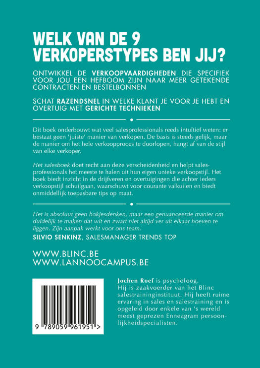 Het salesboek doet recht aan deze verscheidenheid en helpt salesprofessionals het meeste te halen uit hun eigen unieke verkoopstijl. Het boek biedt inzicht in de drijfveren en overtuigingen die achter ieders verkoopstijl schuilgaan, waarschuwt voor courante valkuilen en biedt onmiddellijk toepasbare tips op maat.