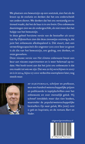 We plaatsen ons bewustzijn op een voetstuk, zien het als de kroon op de evolutie en denken dat het ons onderscheidt van andere dieren. We denken dat het ons verstandig en rationeel maakt, dat het de baas is in ons brein. Ons onbewuste daarentegen zien we als ondergeschikt, als niet meer dan het hulpje van het bewustzijn. In deze geheel herziene versie van de bestseller uit 2007 laat Ap Dijksterhuis zien dat deze zienswijze onzinnig is, dat juist het onbewuste allesbepalend is. Dát stuurt, met een verwerkingscapaciteit die ongeveer 200.000 keer zo groot is als die van het bewustzijn, ons gedrag, ons denken, en onze gevoelens. Deze nieuwe versie van Het slimme onbewuste bevat een keur aan nieuwe experimenten en is weer helemaal up-to-date. Het boek toont aan dat het juist ons onbewuste is dat ons maakt tot wie we zijn. Dat was zo bij verschijnen in 2007 en is in 2024, bijna 127.000 verkochte exemplaren later, nog steeds waar.