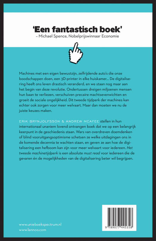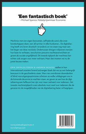 Internationale bestseller over de impact van technologie op ons leven: Google Glasses, zelfrijdende auto's, computers die het menselijk brein vervangen... De digitalisering heeft ons leven drastisch veranderd, en we staan nog maar aan het begin van deze revolutie. 'Vanaf nu wordt de verandering pas echt duizelingwekkend', aldus Erik Brynjolfsson en Andrew McAfee, beiden verbonden aan het prestigieuze MIT. 'En het is aanpassen of verliezen.' Miljoenen mensen dreigen hun baan te verliezen, precaire machtsevenwichten verschuiven en de sociale ongelijkheid groeit. Dit tweede tijdperk der machines kan echter ook zorgen voor meer welvaart. Maar dan moeten we nu de juiste keuzes maken.