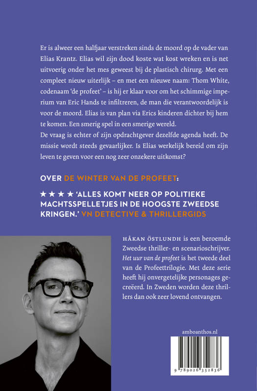 Elias is erop gebrand om de dood van zijn vader te wreken. Daarvoor is hij geheim agent geworden, en is hij zelfs uitvoerig onder het mes geweest bij een plastisch chirug. Als 'Thom White', codenaam 'de Profeet', is hij er klaar voor om het schimmige imperium van Eric Hands, de man achter de bomaanslag op zijn vader, te infiltreren. Zijn plan: via Erics kinderen toegang krijgen tot de man zelf. Een smerig spel in een smerige wereld. De vraag is echter of zijn opdrachtgever wel dezelfde doelen heeft als Elias zelf. Zijn missie wordt steeds gevaarlijker. Is Elias werkelijk bereid om zijn leven te geven voor een doel waar hij zelf niet achter staat? 'Het uur van de profeet' is het tweede boek in de Profeet-trilogie. Het verhaal van Elias begon in 'De winter van de profeet' en gaat verder in 'De nacht van de profeet'.