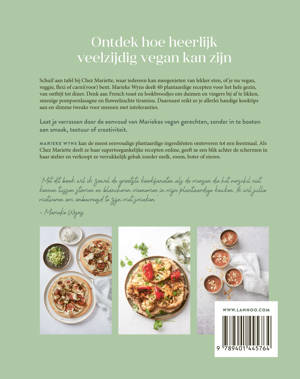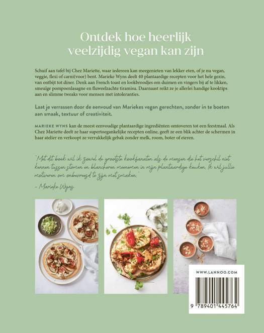 Schuif aan tafel bij Chez Mariette, waar iedereen kan meegenieten van lekker eten, of je nu vegan, veggie, flexi of carni(voor) bent. Marieke Wyns deelt 40 plantaardige recepten voor het hele gezin, van ontbijt tot diner. Denk aan French toast en lookbroodjes om duimen en vingers bij af te likken, smeuïge pompoenlasagne en fluweelzachte tiramisu. Daarnaast reikt ze je allerlei handige kooktips aan en slimme tweaks voor mensen met intoleranties.