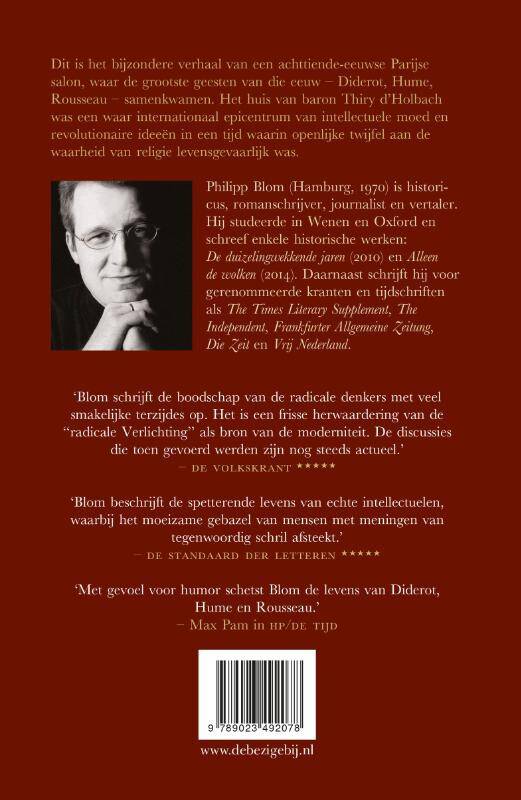 Dit is het bijzondere verhaal van de achttiende-eeuwse Parijse salon van Baron Thiry d’Holbach, waar de grootste geesten van die eeuw – Diderot, Hume, Rousseau – samenkwamen. De radicale filosofie die tussen 1750 en 1770 in deze salon tot bloei kwam, is van historisch belang geweest voor de ontwikkeling van het sceptische moderne denken. Het huis van d’Holbach was een waar internationaal epicentrum van intellectuele moed en revolutionaire ideeën in een tijd waarin openlijke twijfel aan de waarheid van religie levensgevaarlijk was. Deze mensen waren de eerste atheïsten. Blom verbindt de levensverhalen van de verschillende gasten van de salon met de ontstaansgeschiedenis van hun ideeën. Hij vertelt over de onderlinge vriendschappen, waarvan sommige in diepe afkeer, zelfs haat eindigen – bijvoorbeeld die tussen Diderot en Rousseau – alsof hij de mensen zelf heeft gekend.