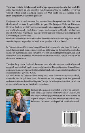 Tien jaar lang reisde Frederiek Lommen naar alle windstreken van Griekenland en sprak met politici, ondernemers, diplomaten, Roma-zigeuners, journalisten, daklozen, mensenrechtenactivisten, studenten, hoteliers, universiteitsprofessoren en vooral met de ‘gewone’ Griek. Dit boek toont de Griekse samenleving in al haar facetten: de rol van de kerk, de macht van de politieke clans, de toestroom van immigranten, het groeiend rechtsextremisme, de verhouding met Turkije, de milieuproblematiek, de rol van de toeristische sector en het Grieks terrorisme.
